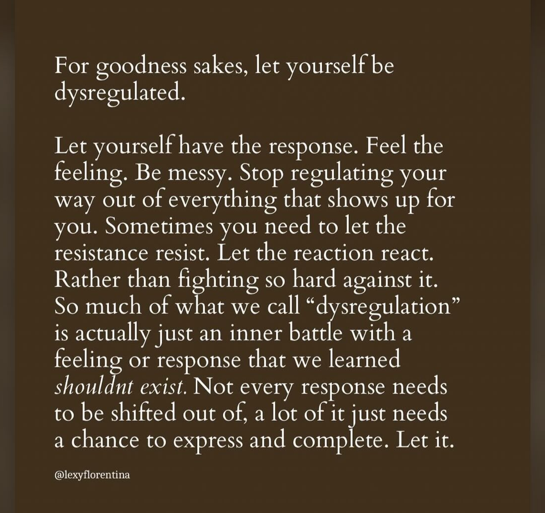 There was a post on Instagram recently I shared that discussed dysregulation and our need as humans to feel it through. It is SO important to not overuse therapy language that encourages the only goal being a place of perfect calm: protect your peace, you HAVE to be regulated before anything else, as if we are so fragile any minor inconvenience is too much to handle. While at times it’s funny and true that our animal brains and responses don’t make us feel very evolved, we are actually a very capable species overall (for the most part) ;).